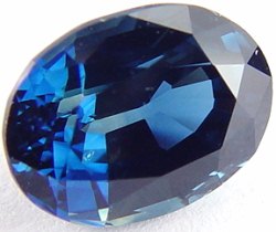 corundum is composed of pure alumina; its colouring is due to metallic | | oxide traces or inclusions. The color of sapphire, due to iron and titanium oxide, gives its best | | effect under daylight. Electric light makes it often dark. | | Gems are generally found in alluvium, but come either from basaltic slags, or from metamorphized