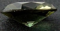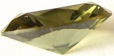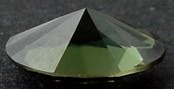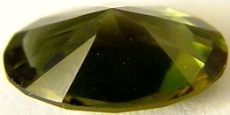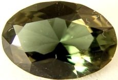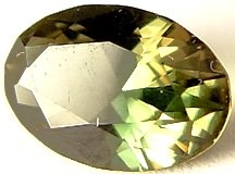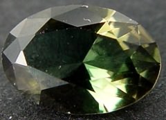 kornerupine is overall greenish. Blue and yellowish sparkles are visible when